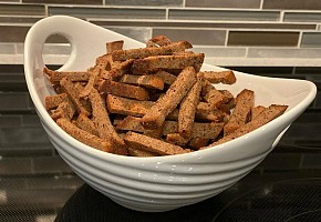 На линии гренок - готовый багет на аппарате нарезать кружочками .